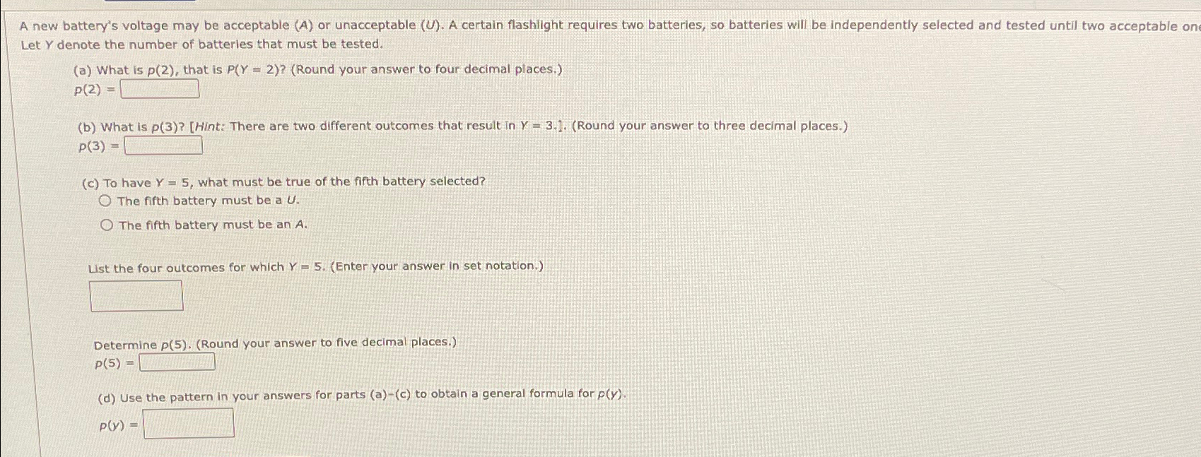 Solved A new battery's voltage may be acceptable (A) or A New Battery's Voltage May Be Acceptable Web a new battery’s voltage may be acceptable (a) or unacceptable (u). A certain flashlight requires two batteries, so batteries will be. A certain flashlight requires two batteries, so. A new battery's voltage may be acceptable (a) or unacceptable (u). A new battery's voltage may be acceptable (a) or unacceptable (u). A certain flashlight requires two batteries, so batteries will. A New Battery's Voltage May Be Acceptable.